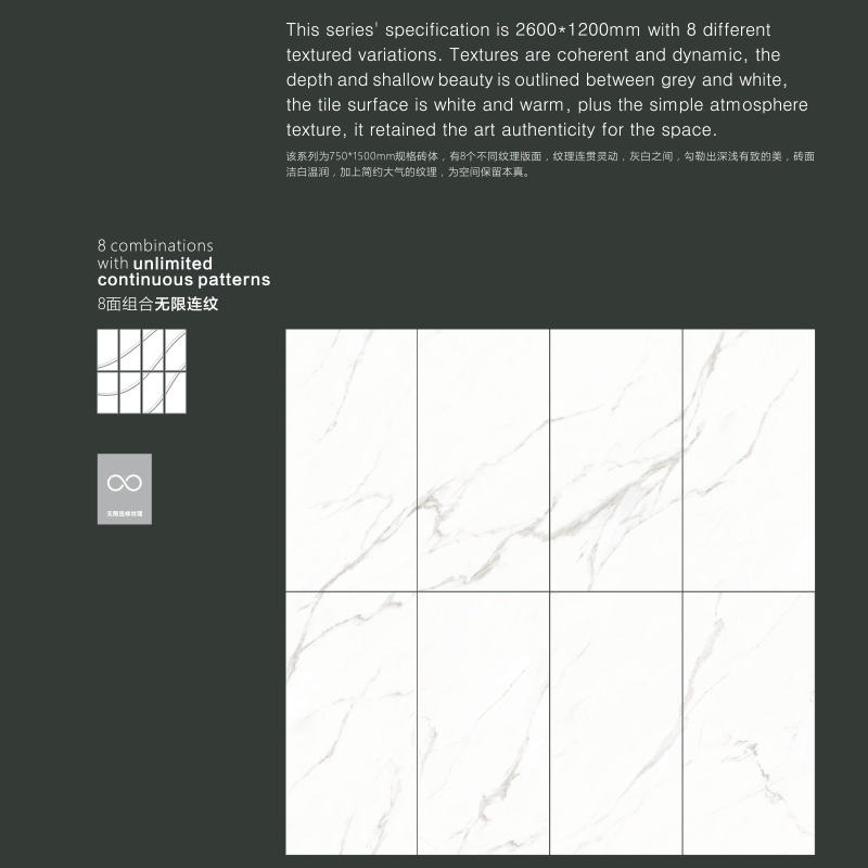 該系列為750*1500mm規格磚體,有8個不同紋理版面,無限連紋組合拼接,紋理連貫靈動,灰白之間,勾勒出深淺有致的美,磚面潔白溫潤,加上簡約大氣的紋理,為空間保留本真。